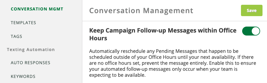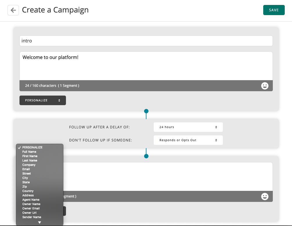 Blog › How To: Make a Drip Campaign How To: Make a Drip Campaign Avochato Product In this tutorial, we'll walk through how to create a simple drip campaign. If you'd like to have campaigns enabled, please reach out to your Avochato sales representative today. Let's start with the intended behavior: when a new customer signs up for your platform, you'd like to send them an initial message that says "Welcome to our platform!" This is a good way to help customers understand that they'll receive texts from your company. The next day, maybe you'd like to send a more personalized note from one of your agents to make yourself available for questions. This might say, "This is Alex at Avochato, please feel free to text me if you have any questions." You can set up this campaign quickly and easily by going to Avochato's new "Campaigns" tab, and creating a new campaign. We'll reference the name for the campaign later when you start sending it. We'll call this campaign "intro" and type in the message that we mentioned previously. For the follow-up message, you can easily personalize your messages to include the name of the agent who will be chatting with this customer by using the variable "Owner Name." Additionally, you can configure the follow up message to be scheduled 24 hours after the initial message, as described before. However, if the customer responds with a question between then, we'll cancel the follow up automatically. This helps ensure that all messages to the customer are timely and relevant. Once the campaign has been saved, you can easily copy the automatically generated shortcut ($campaign_intro) and start sending it. Just like a template or a variable, whenever you send $campaign_intro from Avochato, the first message will be sent and the follow up message will be scheduled automatically. For example, you might incorporate this campaign into your company's auto-response, so that people who text in for the first time are automatically enrolled. Alternatively, if you already have a list of users who need to be contacted, you could send a campaign through a broadcast message and initiate the campaign that way. Check out more ways to send a campaign here. If you're using campaigns to contact customers automatically, we highly recommend that you enable Avochato's office hours in order to ensure that you're only chatting at times that are convenient for your customer and for your team. Make sure that you have enabled the setting to keep campaigns within office hours from your Conversation Management page. If you have a question or an interesting use case for campaigns, reach out and let us know!